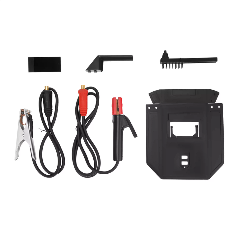 کابل وگیره اتصال به طول1/5 متر.انبروکابل جوش به طول ۲ متر.چکش برس دار.کلاه ایمنی جوشکاری